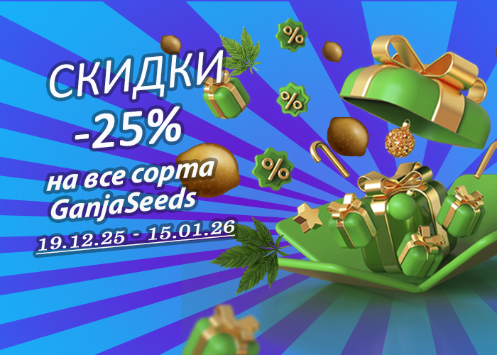 С 19 декабря 2025 по 15 января 2026 действует скидка 25% на ВСЕ сорта GanjaSeeds — фемки, автоцветы, классику и новинки.
