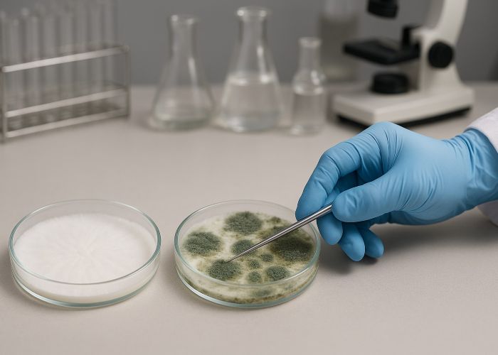 Як тільки ви бачите зелений порошковий наліт на поверхні — усе, спори вже в повітрі. Вони мікроскопічні, леткі й осідають усюди: на одязі, волоссі, стінках боксу, усередині фільтрів, на інструментах. Після цього все приміщення стає потенційною зоною зараження. Навіть нова, ідеально стерильна партія буде під загрозою, якщо не провести глибоку санацію.
