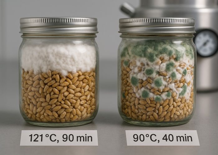 Багато хто вважає, що 60 хвилин на парі — досить. На жаль, це міф. Спори триходерми часто переживають пастеризацію при 65–70 °C. Щоб справді їх знешкодити, потрібна стерилізація в автоклаві або скороварці при температурі 121 °C не менше 90 хвилин. Особливо це критично під час роботи з щільними субстратами, де внутрішні шари прогріваються повільно.